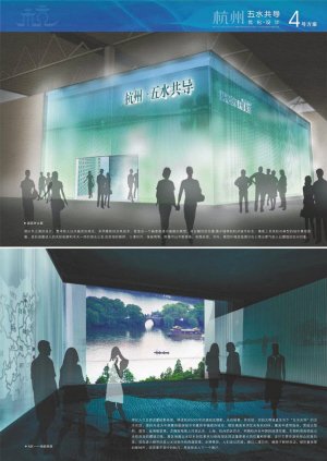 杭州馆的设计是围绕水与人的生活主线,通过“读水”、“说水”、“听水”和“品水”,展示杭州自古以来治理“五水”(西湖、运河、西溪、钱塘江、东海)而换取品质生活的主题。