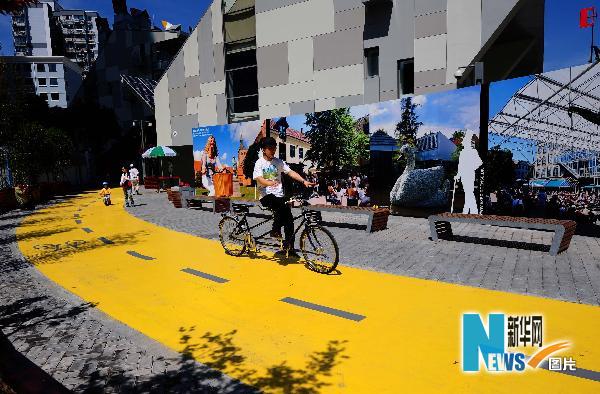 上海世博园欧登塞案例馆中的专用自行车道(5月7日摄)。在上海世博园区浦西展区的城市最佳实践区欧登塞案例馆设有一条自行车道,游客可以感受一下“骑车游世博”的感觉,而欧登塞案例馆的名称就是“自行车的复活”。一百多年前,丹麦城市欧登塞就建设了第一条专用自行车道,从那时起到现在,欧登塞政府始终把发展重心放到限制发展汽车、鼓励市民以骑自行车为主要出行方式的努力上。如今这个有20万人的城市拥有超过40万辆自行车,不少家庭甚至拥有超过十辆自行车。每个来世博园欧登塞案例馆的游客,都忍不住要尝试一下在欧登塞这个自行车城骑车的感觉。十岁的男孩杨焱淇是来自西安青年路小学的学生,平时也喜欢骑自行车。这次父母带着他来上海看世博会,一家三口准备在上海停留一个星期时间。5月7日,他们专门来到欧登塞案例馆,想亲自体验一下来自丹麦的自行车和专用自行车道。 “我们西安也有自行车道,但并不是每条街都有,有的时候骑车的人不得不和汽车或行人混在一起,感觉很紧张”杨焱淇说。工作人员先为杨焱淇和他爸爸准备了一辆双人自行车,父子俩配合得不好,在自行车道摇摇晃晃地骑了一个来回后,杨焱淇自已挑了一辆适合他身高的自行车,爸爸为他带上丹麦传统的自行车安全帽,他一个人在自行车道上骑了过去。工作人员介绍,在欧登塞,开车的人必须让骑车的人。自行车道除了自行车,行人和汽车都不能通过,否则会受处罚。“我觉得这样没有干扰最安全”杨焱淇说,“希望在我们的城市里也能修这么宽敞的自行车专用道,让我们能安全地骑车”。不过杨焱淇也有担忧,他说,中国人太多了,如果也都骑车出行的话,是不是工作效率会受到影响。欧登塞案例馆的工作人员认为,鼓励骑自行车的好处是明显的。数据显示,在最近四年里,欧登塞的交通事故下降了20%,日均二氧化碳排放量降低了8.7吨。欧登塞已经制定了具有远见的交通与流动性计划,主要以步行、自行车以及公共交通工具为主要出行方式。选择骑自行车,就是选择了一种健康和环保的生活。这是未来城市建设和人们生活的必然发展趋势。结束自行车体验后,杨焱淇一家三口准备离开,通过这样的参观与体验,小男孩显然想得更多,他说“这次世博会我最喜欢的地方就是这个案例区域,每一样东西背后都很奇妙,以前老听说环保、低碳等概念,在这里可以看到活生生的例子”。新华社记者 程敏 摄