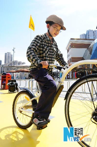 5月7日,杨焱淇在体验欧登塞自行车。新华社记者 程敏 摄