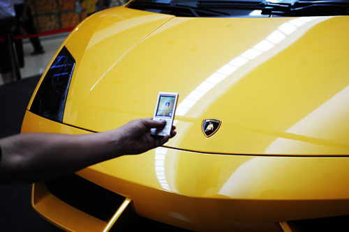7月10日,游客在上海世博园城市最佳实践区博洛尼亚案例馆里拍摄陈列的兰博基尼跑车。