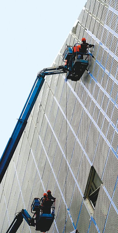 3月2日,工人在国家电网馆外墙面进行装饰施工。据悉,上海世博场馆和配套设施建设已完成了95%以上的工程建设任务。