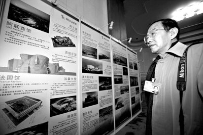 一名人大代表在人民大会堂一层走廊设置的上海世博会场馆介绍展板前观看。