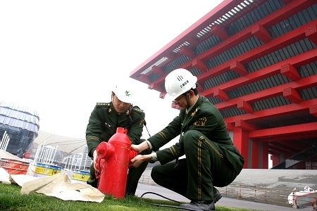 目前,世博园区布展进入冲刺阶段,消防部门昼夜监管施工用火。同时,公安部消防局也派遣约60名各省区市消防员,进入正在布展的世博中国地区馆进行防火监督,他们将助阵各自地区展馆的消防安保直到世博结束。