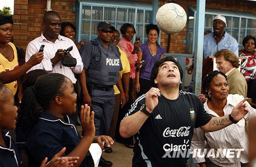 阿根廷国家队主教练马拉多纳(中)受到南非苏姗古威市一所学校学生的欢迎。新华社资料图
