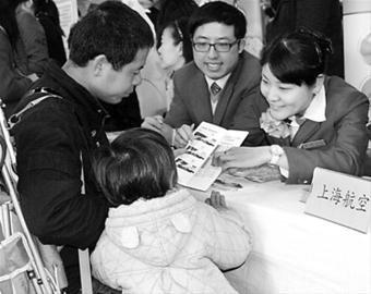 上海航空公司的服务人员正热情地向前来咨询的市民介绍世博会期间上航的特色服务。