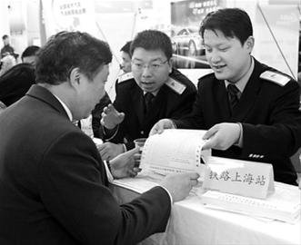 铁路上海站的工作人员正在给前来咨询的市民介绍最新的动车线路。