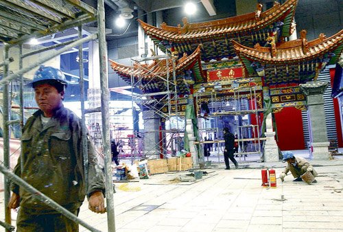 4月3日,建设者在上海世博园内的云南馆施工 新华社