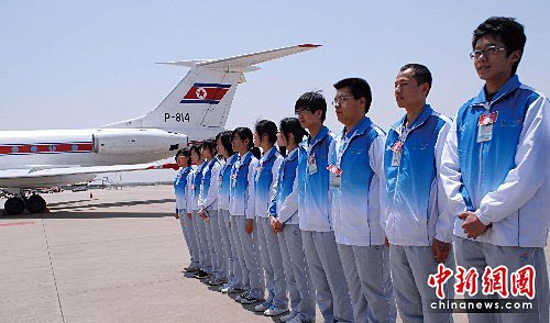 朝鲜最高人民会议常任委员会委员长金永南乘坐专机抵达上海,上海世博会志愿者到机场迎接
