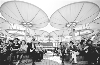 园区内饮料售卖点异常火爆,日本馆旁的排队人流旁,工作人员推来的冷饮车,一来就被参观者抢购一空。瑞士馆参观通道呈环形上升,而巨大的建筑内,有许多空间供游客休息,且因空间高,感觉非常通风凉爽。