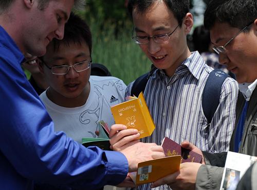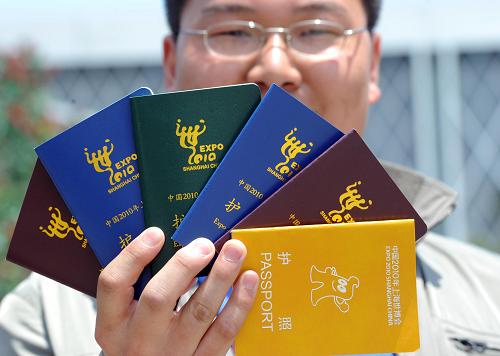 5月1日,来自河北的游客田腾展示自己购买的6本世博护照。当日,上海世博园正式开园,参观者可购买世博护照,在各场馆盖上纪念印章,从而在深入体验游园乐趣的同时,“敲响世博”,获得一件个性化的珍贵藏品。新华社记者金良快摄