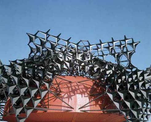 东芝公司场馆由1500个四方形的金属单元围绕而成,代表“未来的森林”之意。