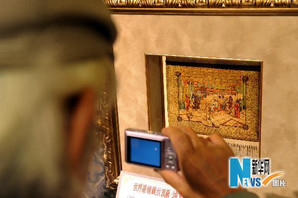 5月13日,在上海世博园伊朗馆,一名参观者在拍摄馆内最精致的波斯挂毯。在上海世博园伊朗馆的二楼,放了一摞摞的波斯地毯,色彩引人注目。其中规格为22×17cm、镶在镜框里用来展示的小块波斯挂毯属于最精致级别。据介绍,这块挂毯100%蚕丝制成,工匠花费了20年的时间、使用放大镜手工精织而成,每一公分的面积里织进了1200段。波斯地毯素以经久耐用而着称,据说一块普通的地毯用上十几年也完整如新,加之其阻燃,于是又被称为“铁毯”。每一块波斯地毯也都是一件工艺品,画面丰富、色彩艳丽。许多人不舍得踩在脚下,就把整块的地毯挂在墙上,做装饰之用。新华社记者李紫恒摄