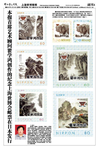 中新网5月18日电 据日本《关西华文时报》报道,5月15日,该报首席艺术顾问曲学鸿创作的纪念上海世博会邮票在日本发行。为了纪念上海世博会的胜利召开,他把中国壮丽的山水美景与上海世博会中国馆结合在一起进行绘画创作,创作了一套6幅纪念邮票图案,并由日本邮便株式会社发行。