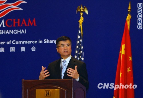 5月19日,正在访华的美国商务部长骆家辉出席上海美商会招待会时表示:中美两国在清洁能源领域的合作前景十分广阔。 中新社发 汤彦俊 摄