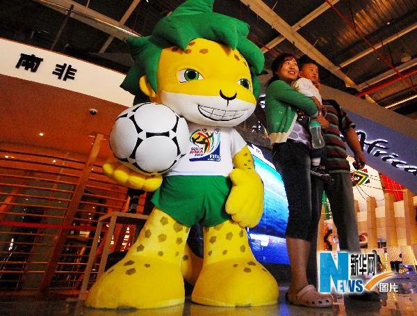 5月7日,游客在世博园南非馆与世界杯吉祥物“扎库米”合影。新华社发