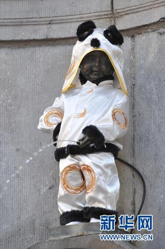 6月5日,比利时首都布鲁塞尔著名的小尿童穿上了熊猫服。 当天,小尿童穿上了由中国四川省成都市赠送的熊猫服。在6月7日上海世博会成都馆日上,比利时馆的小尿童复制品也将穿上一件熊猫服。 新华社记者 武巍 摄