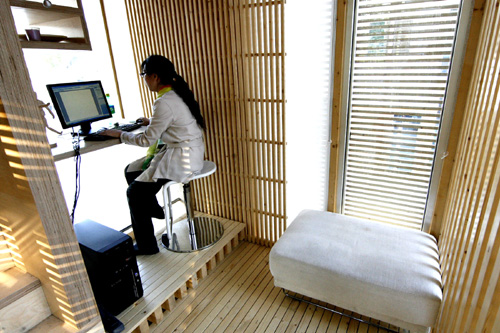 这座名为“可搬运的游客塔”的小房子,是一个来自葡萄牙的展示案例。这是一座占地仅九平方米的三层小楼,拥有二室一厅一厨二卫,可供两人居住,四面的玻璃可采光,同时还具备吸收太阳能的功能,整座建筑呈长方体,横卧可借助平板汽车搬运。在三楼的小阳台上,陈龙坐在一把舒服的椅子上,想象着住在这里晚上抬头看星星的感觉。三楼的卧室是一张不到二米宽的榻榻米,并带有一个小型卫生间。推开玻璃门,可达屋外的阳台,与大自然亲密接触。二楼是书房,除了有一张书桌外,还可容纳一张宽大的单人沙发,看书上网,累了还可在沙发上小憩片刻。