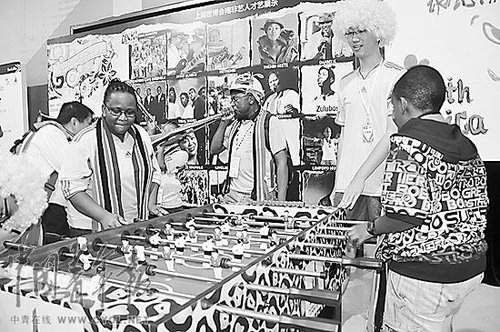 6月11日,观众在世博会南非馆门口玩桌上足球游戏。本报记者 周凯摄