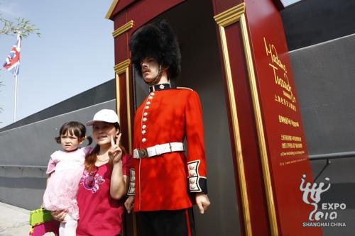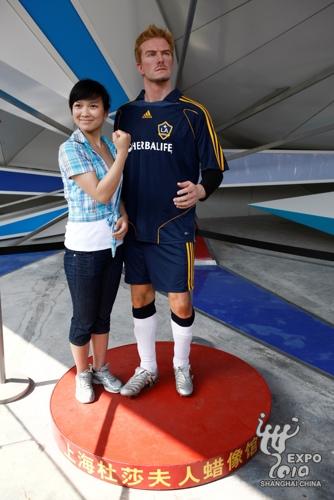 继“足球神童”鲁尼蜡像亮相之后,17日,上海世博会英国馆门口又迎来了英格兰球星贝克汉姆的蜡像;同时,在英国馆城市公园里还竖立着白金汉宫卫兵蜡像。这两个栩栩如生的蜡像引得众多游客纷纷驻足,与英俊潇洒的“小贝”、神秘帅气的“卫兵”合影留念。