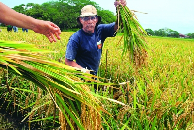 5月1日,哥斯达黎加实验站工作人员在该国北部水稻研究基地收割杂交水稻。 目前,中国杂交水稻在哥斯达黎加北部水稻研究基地已试种成功。预计产量每公顷将达8000公斤。新华社发