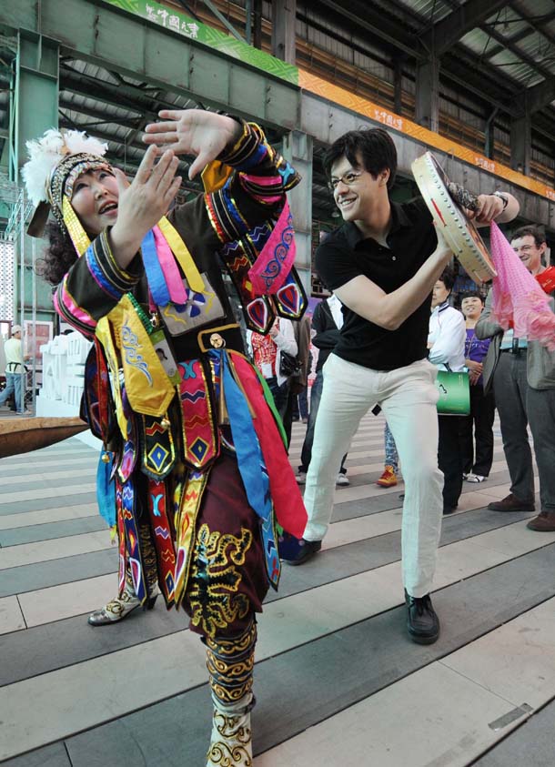 6月10日,在中国元素传习区,丹青在向赫哲族艺人学习萨满舞。新华社记者 王建威 摄