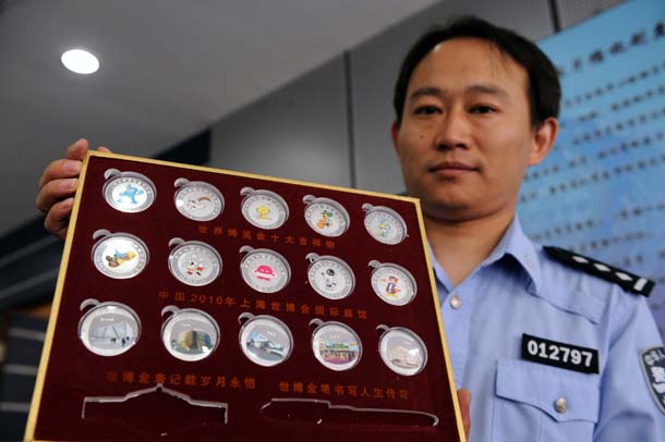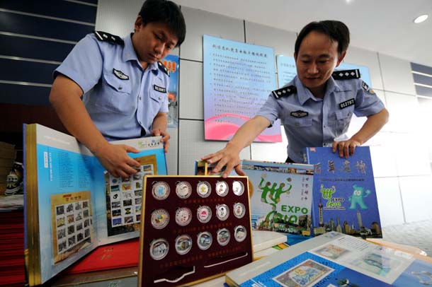 6月28日,民警展示假冒世博会纪念商品。新华社记者 李文 摄