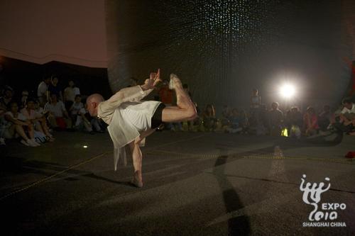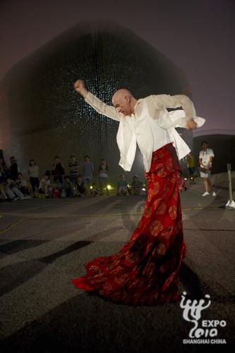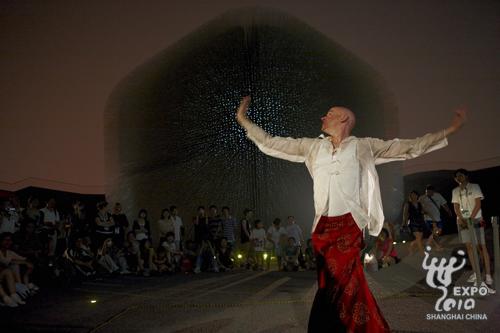 5日晚上,英国艺术家艾伦·格瑞格(Alan Greig)在“种子圣殿”前展现了精彩绝伦的苏格兰现代舞蹈艺术。艾伦 格瑞格是X Factor舞团的艺术总监,他的舞蹈作品集运动、刺激与娱乐性于一体,此次演出片段是根据他在2009年上海舞蹈节中首演的独舞《Into the Light》改编而成。