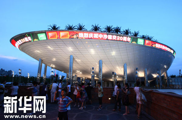 7月21日,沙特馆顶部的环形屏幕打出庆祝中沙建交20周年的字幕。新华社记者 侯俊 摄
