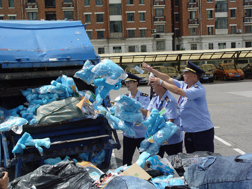 22日上午十时,上海世博局在局内广场举行“世博园区打击整治‘三贩’违法犯罪活动专项行动假冒世博特许商品首次集中销毁仪式”。上海市政府副秘书长、上海世博局局长洪浩出席仪式并宣布将园区首批10万余件假冒世博会特许商品集中销毁。上海世博局党委副书记、上海世博局副局长陈安杰,上海世博局副局长姚志荣等出席仪式。