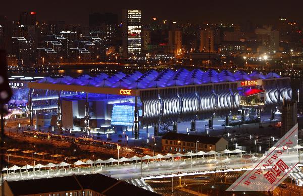 资料图片:中国船舶馆正在进行灯光调试(4月13日摄)。新华社记者 裴鑫 摄