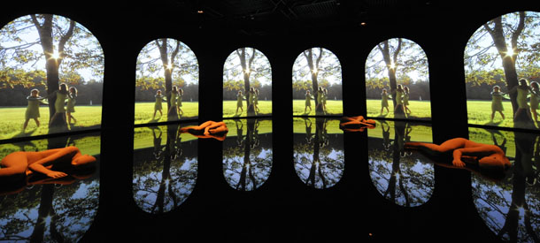 这是上海世博会意大利馆内的“意大利花园:富有激情的建筑”展。通过多媒体影像技术,水中如镜面般的投影和漂浮的雕塑,展现了不同形式的意大利古典和现代景观建筑,营造如梦似幻的视觉体验(9月9日摄)。新华社记者 蔺以光 摄
