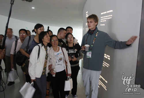 27日上午,网上世博会“展馆直通车”驶入丹麦馆。丹麦馆馆长Stine Guldmann与网上世博会项目总监王立平热情地接待了前来的10名幸运网友,并向他们赠送了精美的礼品。