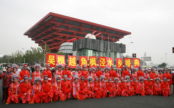 当日,以“中国红·世博缘·枫泾情”为主题的第六届“吴根越角”枫泾水乡婚典,先后在上海金山枫泾古镇和上海世博会世博园区举行,来自江浙沪三地的20对新人,通过“让世界见证你的爱”送亲仪式、婚典仪式和园区巡游,走进婚姻的殿堂。据悉,将中国江南传统民俗婚礼安排在世博园内举行尚属首次。