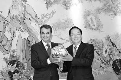 中共中央政治局委员、上海市委书记俞正声(右)将2010年上海世博会国礼花瓶“青花宴·印象世博”赠送外国友人