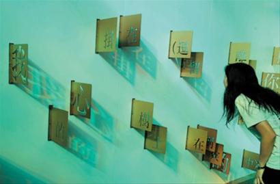 在宝钢大舞台传习区展出的艺术作品《瞬影》,随着光线的变化,墙上的字能映射出一首诗。(邵剑平 摄)