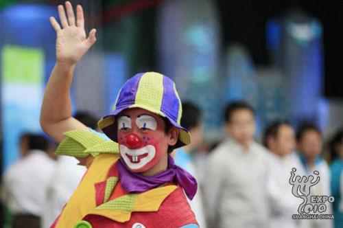 装扮成小丑形象的演员在宝钢大舞台前迎接八方来客