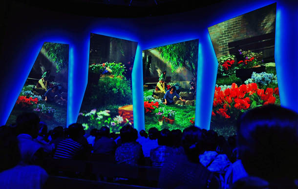 精心“打造”的美国馆吸引了一拨又一拨游客。馆内从“可持续发展”、“团队协作”、“健康生活”、“美国华人成就”四个方面来演绎“拥抱挑战”的主题,展示了美国的文化、价值观、创新精神和商业成就。美国馆的外观像一只展开双翅的雄鹰,馆外有飞流而下的“瀑布”,馆内可以看4D电影,展览让人们充分感受美国的现代科技和社会文明。刘青好奇地走进了美国馆。“哇,这么宽的银幕,这么清晰的图像,‘天’还会下‘雨’,让人感觉身临其境,太神奇了。”第一次看到4D电影的她感到十分震撼。馆内设有3个演播厅,每个演播厅播放不同的内容。“这里的每一场电影都很好看,真是过瘾。”刘青说,“让我感触最深的是《花园》。影片介绍的是一个小女孩看到一片废弃的空地,想象着把它变成一个繁茂的花园。她的激情和决心启发了她的邻居,在他们共同的乐观、创新和合作精神的指引下,他们用自己的双手让曾经破败和灰暗的城市呈现出梦幻般的美好景象。”这个短片故事没有任何言语对话,都是通过图像、音乐等效果去表达,无需翻译就能让每个人都能理解影片的内容。“我这个来自农村的女孩也能看懂这个没有对话的电影。”刘青感到很满足。看完4D电影,刘青来到最后一个展示体验空间。这里介绍的是美国人如何让他们的社区变得更加健康、可持续以及具有文化多样性。刘青边走边看,一会儿看看科技成果介绍,一会儿到健康创想空间的电脑显示屏前体验“透视自己”,一会儿点击触摸屏查询信息,一会儿瞧瞧展卖的纪念品……“这里的一切对我来说都很新奇。”刘青说。
