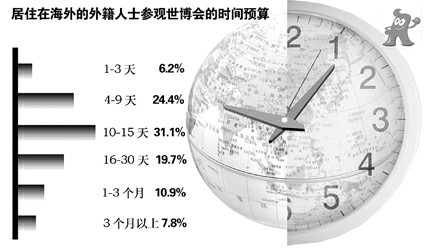 不仅要参观世博会,还要游上海,看看老式洋房(见图①);品中国,游走江南小桥流水,体会北京雄浑壮阔。调查显示,上海世博会将对中国尤其是长三角地区和北京的旅游起到显著带动作用。超过30%的外籍人士表示将在中国停留10-15天(见图②)。超过80%的外籍人士有兴趣在参观世博会之余在上海旅游;近75%的外籍人士计划到中国其他地方旅游,其中31%的人将前往北京,杭州、苏州和南京是长三角地区除上海外欧美游客最向往的城市,宁波和无锡则在亚洲游客中最受欢迎。