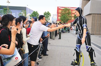 6月2日,由德国馆工作人员装扮的“未来机器人”为游客表演。以缓解游客排队时的烦闷。新华社记者李俊东摄
