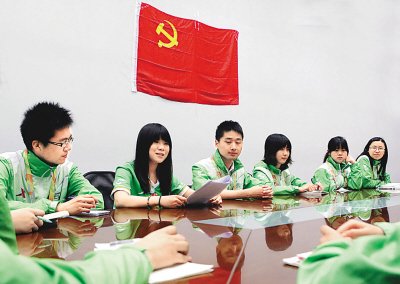 6月1日,复旦新闻学院世博临时党支部在世博园区内过组织生活。新华社发