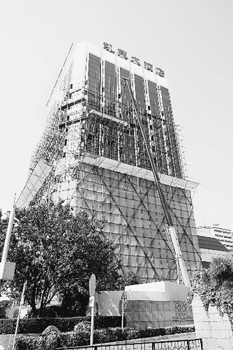 7月20日,位于北京建国门桥东南角的四星级凯莱大酒店外搭建起脚手架,准备开拆。该酒店仅“存活”20年。人民图片