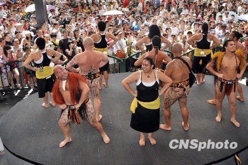 7月25日,上海世博园新西兰馆(网上新西兰馆)前的舞台上,几名身着传统服饰、全身布满粗犷纹身的毛利人表演土著舞蹈“哈卡战舞”。舞蹈热情似火,深深感染着现场观众,不时博得阵阵掌声。 中新社发 残弓 摄