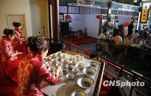 5月4日,上海世博会北京周启动,微缩版的老舍茶馆亮相世博园区,32个大茶碗组成的“碗琴”演奏着《故乡是北京》,令人耳目一新。 中新社发 潘索菲 摄
