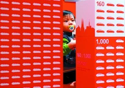 □不来梅馆内,一名小观众在看通过“拼车”实现“160辆汽车可取代1000辆汽车”功效的展板。新华社图片