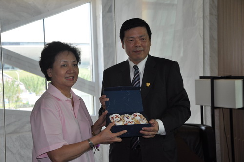 台湾馆总馆长叶明水为台湾校长代表赠送台湾馆礼物。