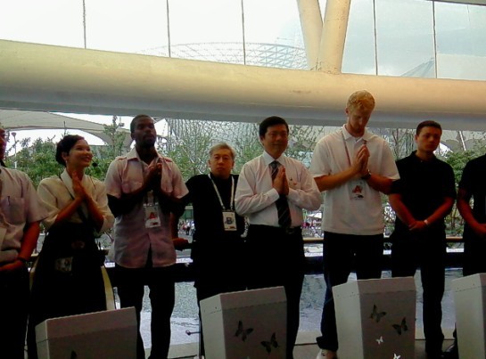据世博会台湾馆消息:“世界和平、爱与和平”、“家人健康”,7月26日下午,两名NBA火箭队球星巴丁格、布鲁克斯在世博园台湾馆和8名中国小朋友一起,参加点灯祈福仪式,他们用放飞孔明灯的仪式共同许愿祈福。