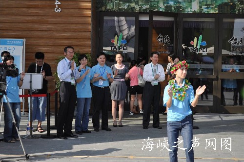 紧接着,在宝山教师放声高歌下,以经典的台湾老歌带出资源回收的重要性。随后主持人更以活泼逗趣的把垃圾带回家的互动游戏让游客了解台北市民每日垃圾分类及资源回收的状况,逗得现场民众笑声连连、掌声不断。宝山教师们更是使出拿手绝活,带领全体共跳广场集体舞。最后,台北馆与宝山区教育局两地代表互赠教师节礼物,台北馆赠送致赠台北名产凤梨酥、台北国际花卉博览会的邀请卡及花博一日劵二张,及台北馆赞助单位富士康科技集团也致赠LED灯给宝山区教育局,宝山区教师也回赠宝山师生创作的“吹塑版画”。
