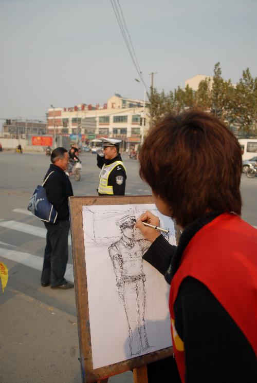 今天下午,40余块画板出现在宝山区沪太路、新沪路路口,上海邦德职业技术学院的学生志愿者以“我眼中的世博警察”为主题,通过素描、水彩画等方式,将交警的执法瞬间及周边市民文明出行面貌记录下来。