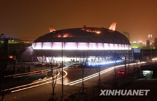 这是首次亮灯的世博会日本国家馆(12月25日摄)。12月25日,上海世博会日本国家馆首次亮灯,庆贺次日竣工。馆内灯光忽明忽暗,象征生命在呼吸。日本国家馆半圆形的大穹顶,宛如一座“太空堡垒”。据了解,日本国家馆集多种顶尖的节能环保技术于一体,它可以吸收阳光为自己提供能量,汲取雨水为自己降温,并能保持“体内”的呼吸通畅。新华社记者 裴鑫摄