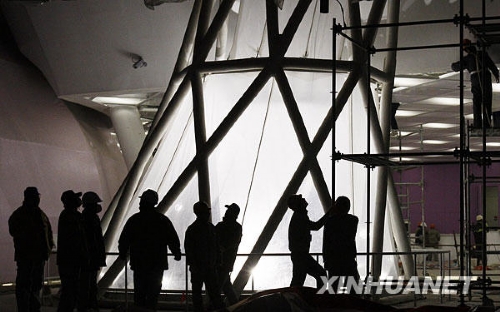 12月25日,工人正在日本国家馆内调试灯光。新华社记者 裴鑫摄